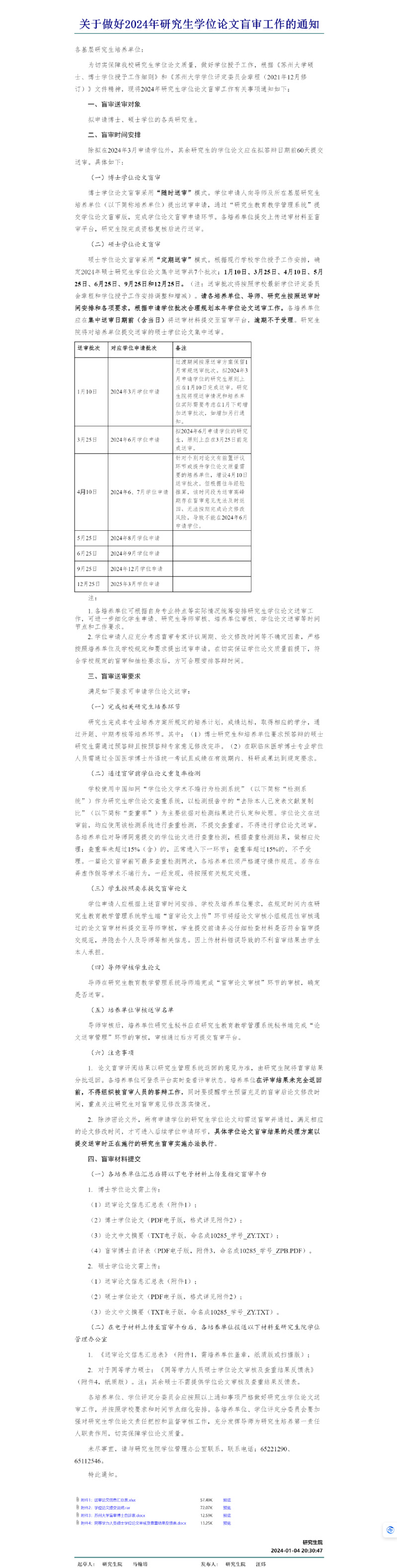 根据《苏州大学硕士、博士学位授予工作细则》(苏大学位〔2012〕20号)、《苏州大学硕士、博士学位论文盲审实施办法》(苏大研〔2024〕4号)以及《苏州大学关于进一步加强研究生学位论文质量全过程管理的意见》(苏大研〔2020〕115号)等文件精神,2024年学位论文盲审工作即将开始,请2024年答辩的研究生做好相关工作。