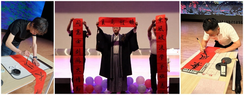 高潮过后,我们来到了宁静的江南水乡。透迤带绿水,迢递起朱楼。提到江南,眼前便浮现出了黑瓦白墙,小桥流水的秀丽景色,张振华老师、程观剑与朱云昊同学带来的《忆江南》,让我们看到烟雨萧音与软笔书法碰撞擦出的火花,点亮终章“尾声·踵事增华”。
