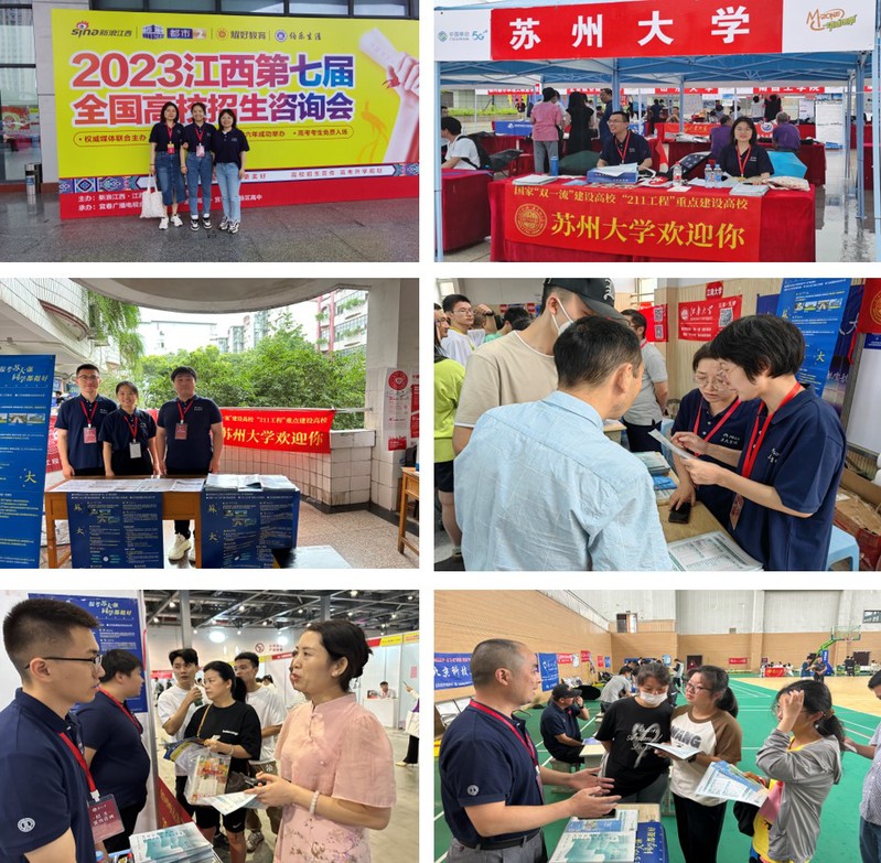 在江西,由特聘教授冯莱和朱国斌、郑黎军、金霞、陈成喜、赵亮、顾燕、王晓东、张丽亚、王丹、魏义凡等老师组成的江西招生宣传工作组于6月24日至6月26日在南昌、吉安、宜春、上饶、九江、赣州等地展开招生宣传工作。招生组通过在江西师大附中、九江一中、九江三中、进贤县一中、婺源天佑中学、上饶贞白中学等优质中学的宣讲和参加江西高校咨询会等方式,为考生和家长详细介绍了苏州大学在江西的各项招生政策、历年录取分数线和位次,前来咨询的考生和家长络绎不绝,他们对新能源材料与器件、能源与动力工程、纳米材料与技术、临床医学、人工智能等专业表现出浓厚兴趣,招生组成员也耐心细致地为考生和家长答疑解惑并鼓励考生报考,遇见千年姑苏,圆梦百廿苏大。