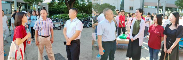 学校和学院领导在迎新现场亲切慰问迎新志愿者,了解报到情况,所学专业,并与新生和家长们交谈。
