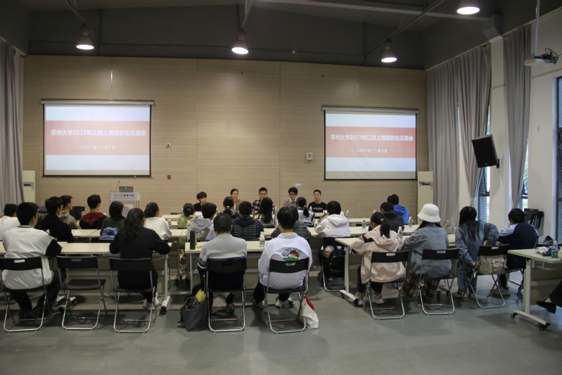 魏义凡老师对与会同学表示诚挚地欢迎,介绍了2023年苏州大学在上海市、江西省的招生情况。22级上海籍学生代表陈宇华和江西籍学生代表刘建润作为老生代表发言,他们分享了各自在大学的学习心得以及大学生活中可能遇到的各种问题及应对方法,鼓励同学们积极参加学校组织的各类活动。他们希望各位新生在努力拼搏的同时,及时把握住踏入未来的航向,不迷茫于当下,不胆怯于未来。